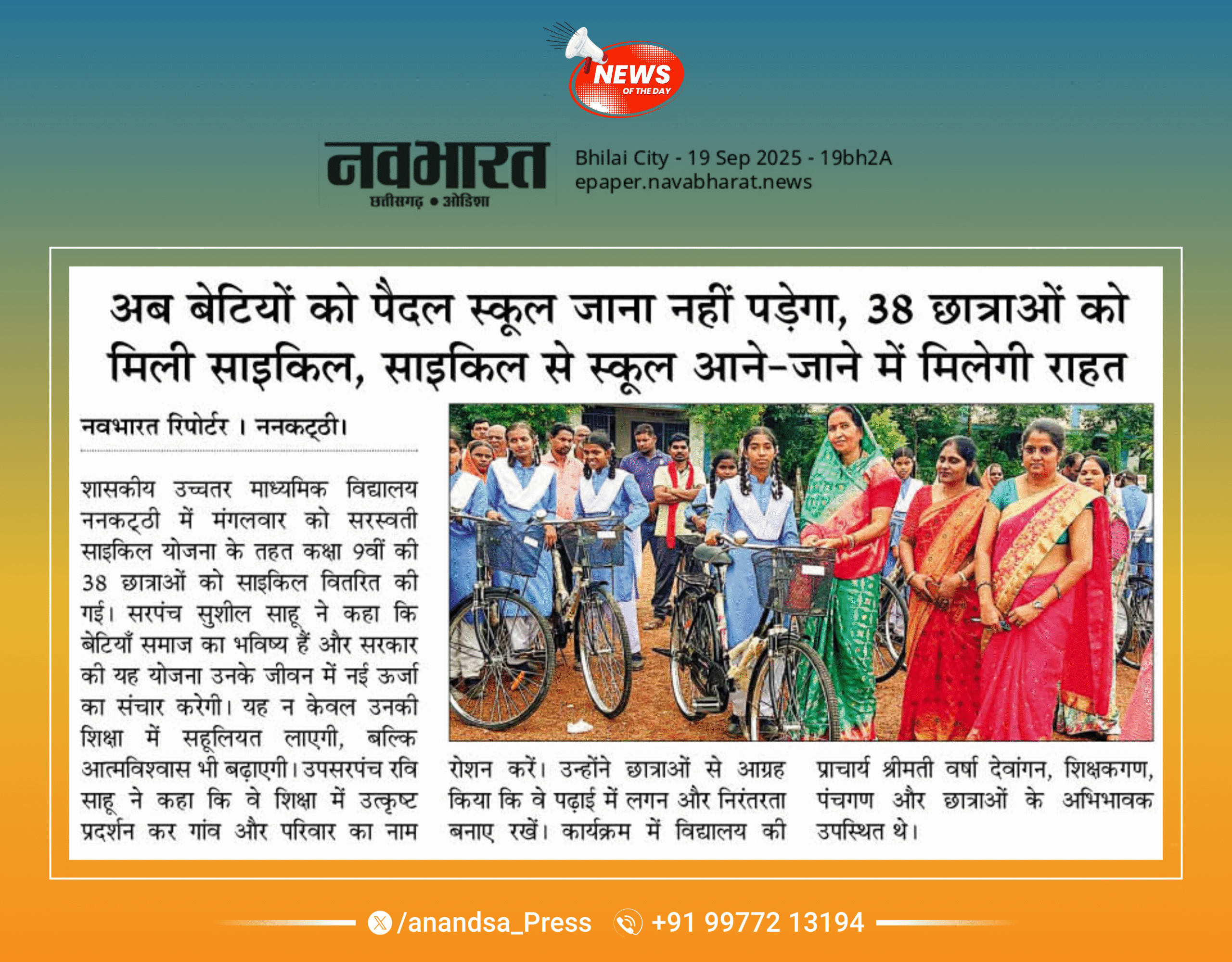 शासकीय उच्चतर माध्यमिक विद्यालय ननकट्ठी में मंगलवार को सरस्वती सायकल योजना के तहत कक्षा नवमी की 38 छात्राओं को साइकिल वितरित की गई। यह पहल विशेष रूप से ग्रामीण और आर्थिक रूप से कमजोर परिवारों की बेटियों को विद्यालय आने-जाने में सुविधा प्रदान करने के उद्देश्य से चलाई जा रही है। सरपंच सुशील साहू ने कहा, “बेटियाँ समाज का भविष्य हैं और सरकार की यह योजना उनके जीवन में नई ऊर्जा का संचार करेगी। यह न केवल उनकी शिक्षा में सहूलियत लाएगी, बल्कि आत्मविश्वास भी बढ़ाएगी।” उपसरपंच रवि साहू ने छात्राओं को प्रोत्साहित करते हुए कहा कि वे शिक्षा में उत्कृष्ट प्रदर्शन कर गाँव और परिवार का नाम रोशन करें। उन्होंने छात्राओं से आग्रह किया कि वे पढ़ाई में लगन और निरंतरता बनाए रखें।