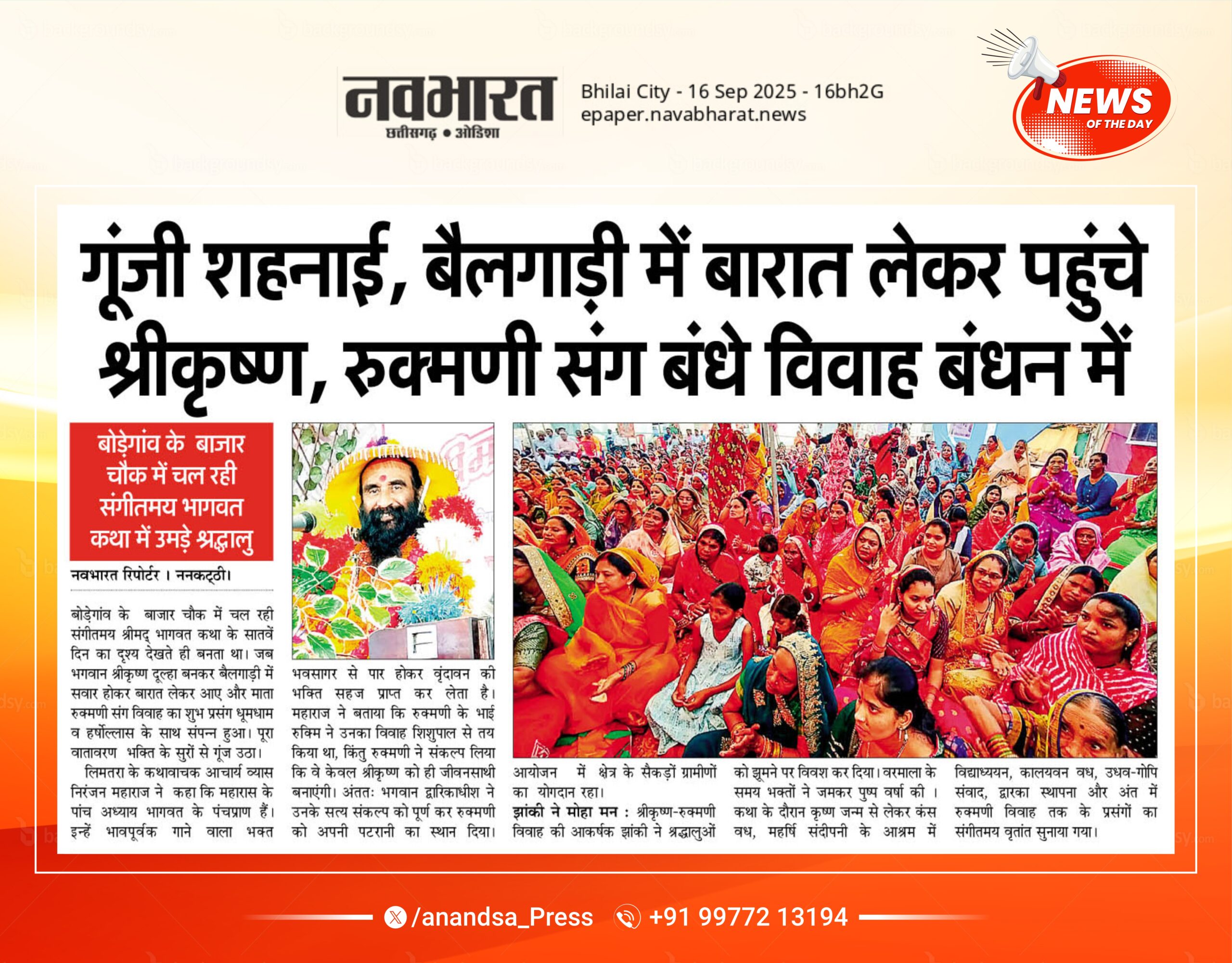 बोडेगांव के हृदय स्थल बाजार चौक में चल रही संगीतमय श्रीमद् भागवत कथा के सातवें दिन का दृश्य देखते ही बनता था। जब भगवान श्रीकृष्ण दूल्हा बनकर बैलगाड़ी में सवार होकर बारात लेकर आए और माता रुक्मणी संग विवाह का शुभ प्रसंग धूमधाम व हर्षोल्लास के साथ संपन्न हुआ। पूरा वातावरण जय-जयकार और भक्ति के सुरों से गूंज उठा।