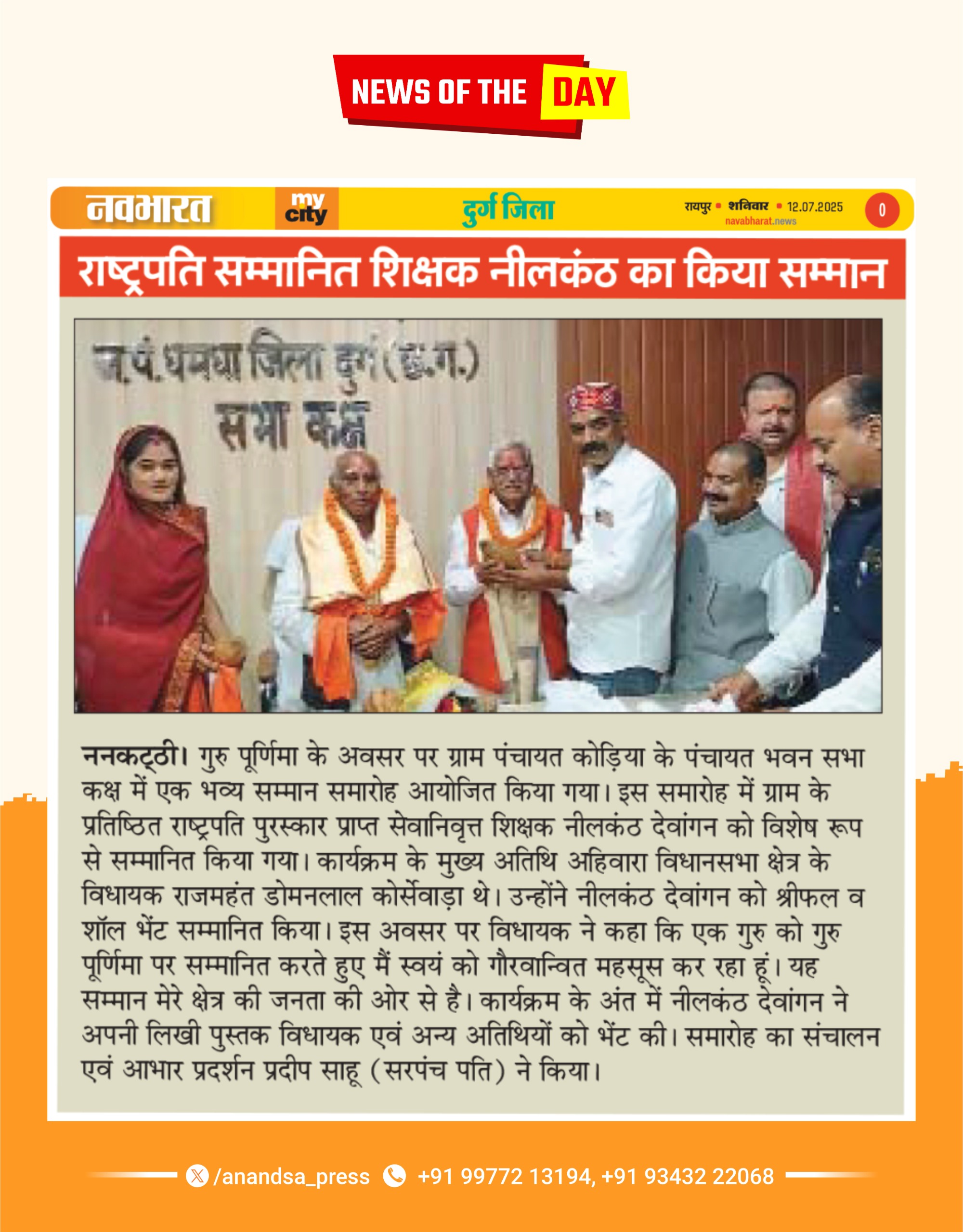गुरु पूर्णिमा के पावन अवसर पर ग्राम पंचायत कोड़िया के पंचायत भवन सभा कक्ष में एक भव्य सम्मान समारोह आयोजित किया गया। इस समारोह में ग्राम के प्रतिष्ठित राष्ट्रपति पुरस्कार प्राप्त सेवानिवृत्त शिक्षक नीलकंठ देवांगन को विशेष रूप से सम्मानित किया गया।