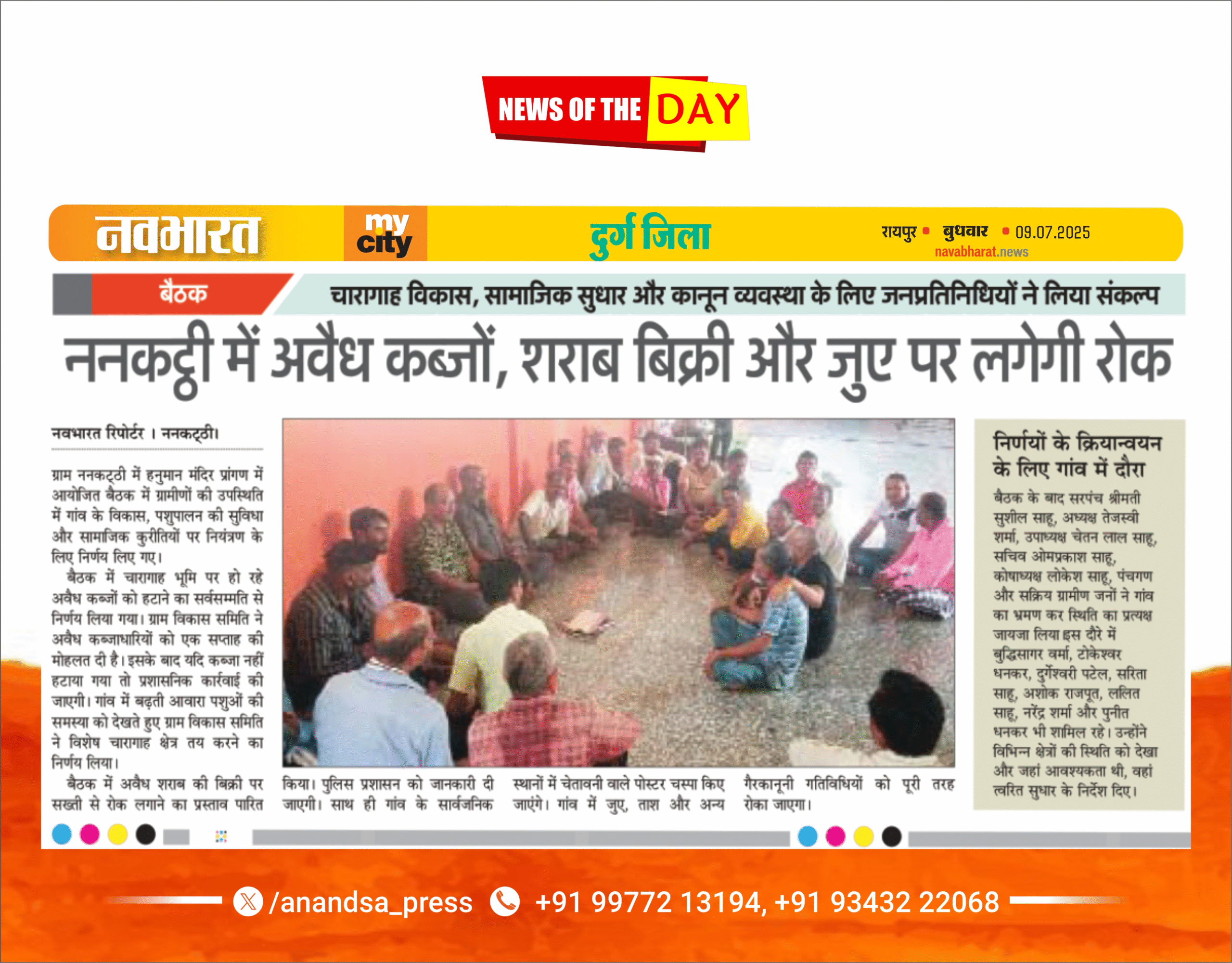 बैठक में अवैध शराब की बिक्री पर सख्ती से रोक लगाने का प्रस्ताव पारित किया। तय किया कि इस प्रकार के कार्यों की जानकारी पुलिस प्रशासन को तत्काल दी जाएगी। साथ ही, गांव के सार्वजनिक स्थानों पर चेतावनी वाले पोस्टर चस्पा किए जाएंगे।